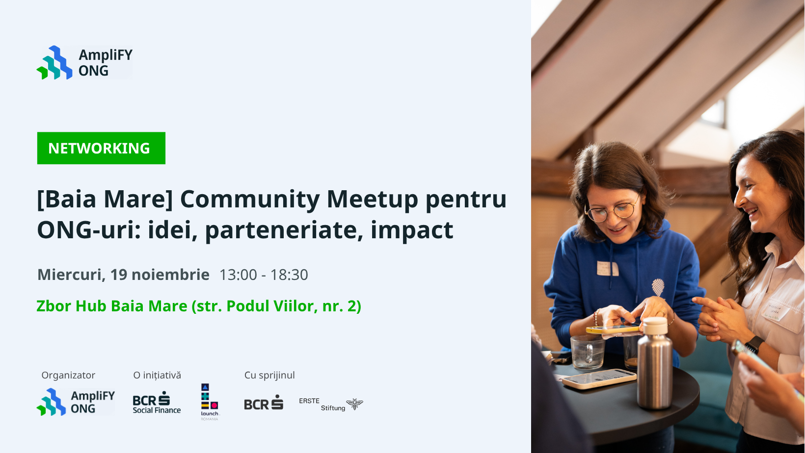 AmpliFY ONG organizează pe 19 noiembrie o întâlnire de comunitate la Baia Mare dedicată colaborării și sprijinului reciproc între organizațiile non-profit. La întâlnire sunt așteptați, de asemenea, profesioniști și antreprenori care își doresc să cunoască organizațiile și inițiativele cu impact în comunitatea locală.