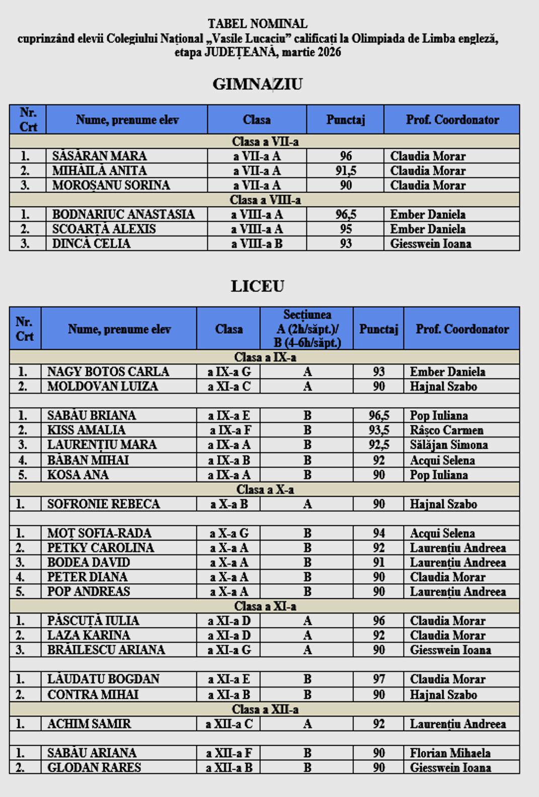 Prin rezultatele obținute și numărul mare de elevi care vor reprezenta colegiul în următoarea etapă a competiției, Colegiul Național „Vasile Lucaciu” își confirmă și în acest an locul în topul performanței academice, atât la gimnaziu, cât și la liceu.
