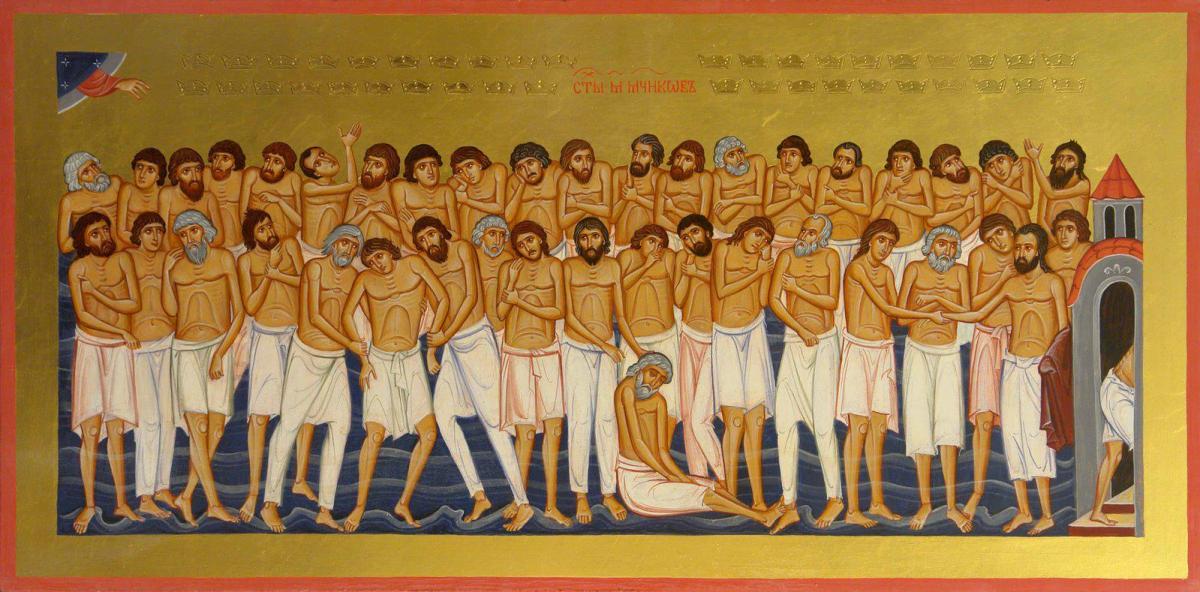 La asfințitul soarelui, Sfinții Mucenici au fost dezbrăcați de haine și aruncați goi în lacul înghețat al Sevastiei. Era ger cumplit și se chinuiau de iuțimea frigului. Dar ei strigau la Dumnezeu să le dea putere și răbdare până la sfârșit.