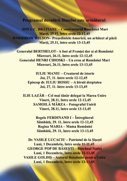 Vizionarea filmelor documentare din seria „OAMENII MARI CARE AU FĂCUT ROMÂNIA MARE” (realizator: Lucia Hossu-Longin). Filmele prezintă portretele unor personalități care și-au adus contribuția la formarea statului național unitar și la consolidarea lui.