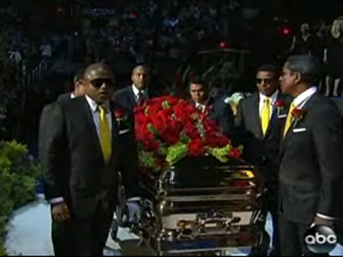 Dupa serviciul funerar privat, sicriul aurit, acoperit cu flori rosii, in care se afla corpul neinsufletit al Regelui muzicii pop, a fost dus la Staples Center, unde a fost asezat in fata scenei, sub privirile a sute de milioane de fani din intreaga lume care au urmarit evenimentul online sau in fata televizorului.