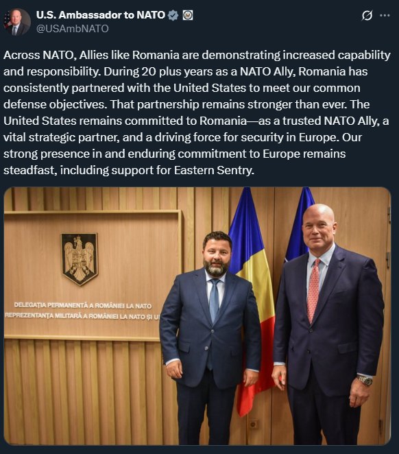 „În cadrul NATO, aliați precum România demonstrează o capacitate și o responsabilitate sporite. De peste 20 de ani, România, în calitate de aliat NATO, colaborează constant cu Statele Unit pentru a îndeplini obiectivele comune de apărare. Acest parteneriat este mai puternic ca niciodată. Statele Unite rămân angajate față de România – ca aliat de încredere al NATO, partener strategic vital și motor al securității în Europa. Prezența noastră solidă și angajamentul durabil față de Europa rămân neclintite, inclusiv sprijinul acordat misiunii Eastern Sentry” a subliniat Ambasadorul SUA la NATO, Matthew Whitaker
