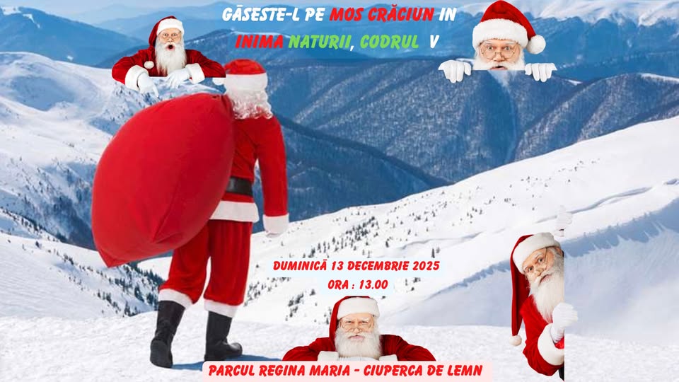 Asociatia Energia Mișcării alături de Spartan Kids Training Group Baia Mare și Daco Spartanii organizează cea de-a V a ediție a super aventurii unice și inedite „Găsește-l pe Moș Crăciun în inima naturii, Codrul”, o nouă experiență de vis în Spiritul Crăciunului. Aventura de până la trei ore va avea loc în 13 decembrie, ora 13.00. Locul de întâlnire este Parcul Regina Maria în față la ciuperca de lemn.