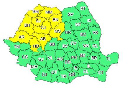 În intervalul menționat, local în vestul, nord-vestul și centrul țării vor fi perioade cu instabilitate atmosferică accentuată ce se va manifesta prin frecvente descărcări electrice, intensificări ale vântului (rafale în general de 55…70 km/h și izolat peste 80 km/h), vijelii, averse ce vor avea și caracter torențial (în intervale foarte scurte de timp cantitățile de apă vor fi de 20…25 l/mp și izolat peste 30…40 l/mp) și grindină.