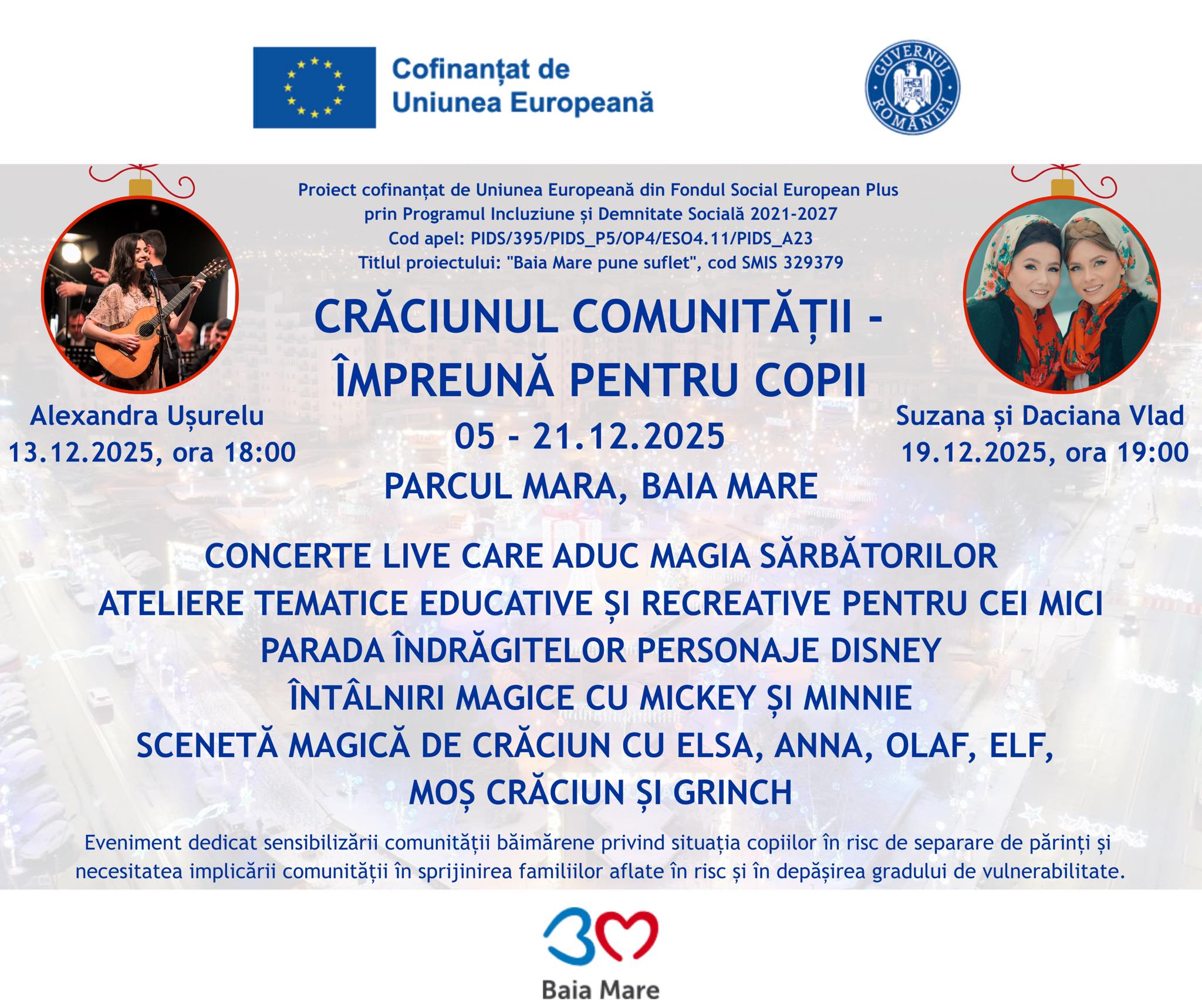 Baia Mare aprinde luminile solidarității în această iarnă. „Crăciunul Comunității – Împreună pentru copii”, eveniment organizat în cadrul proiectului „Baia Mare pune suflet”, aduce între 5 și 21 decembrie una dintre cele mai ample acțiuni dedicate sprijinirii copiilor aflați în risc de separare de părinți și familiilor vulnerabile din oraș.