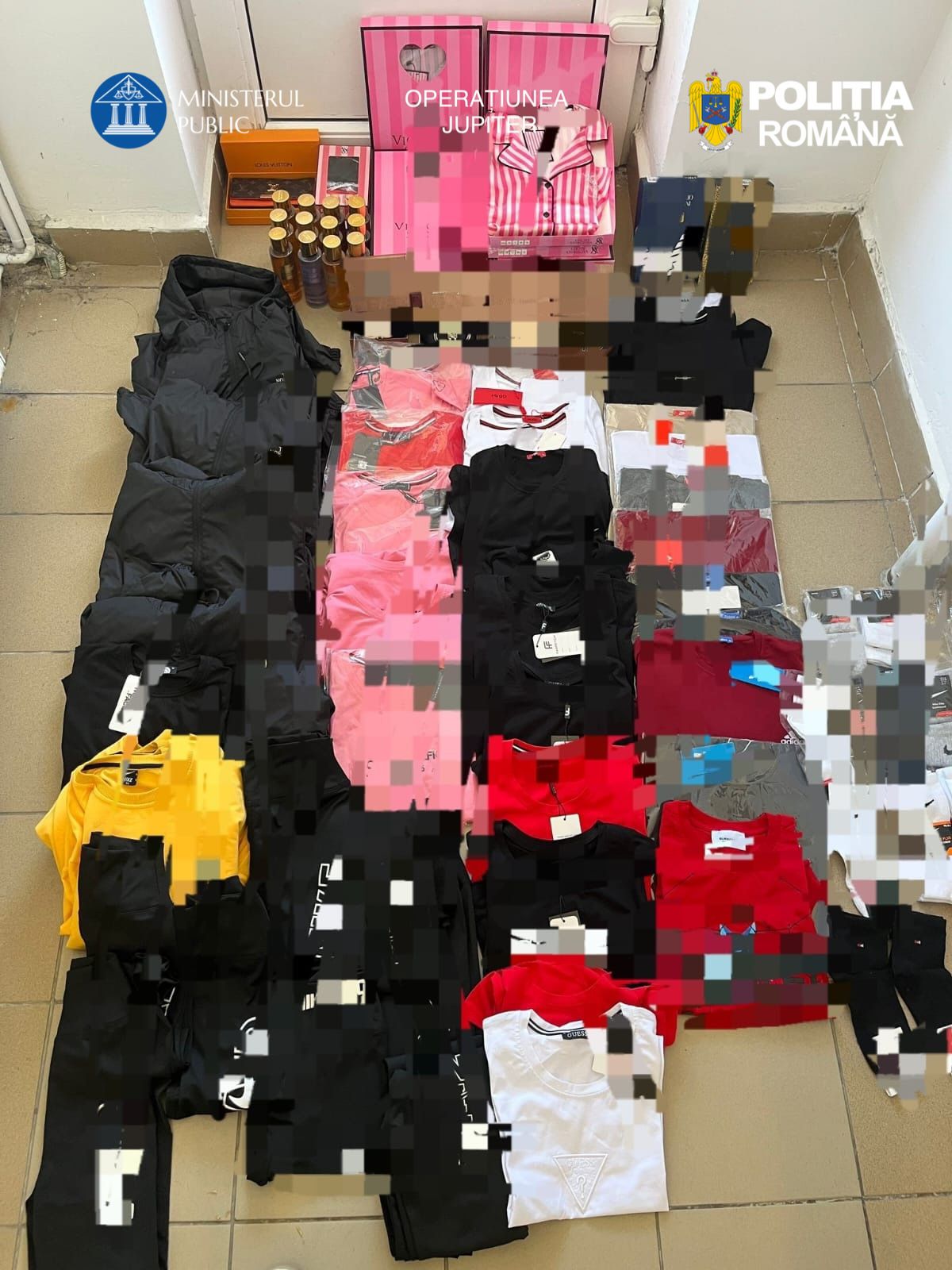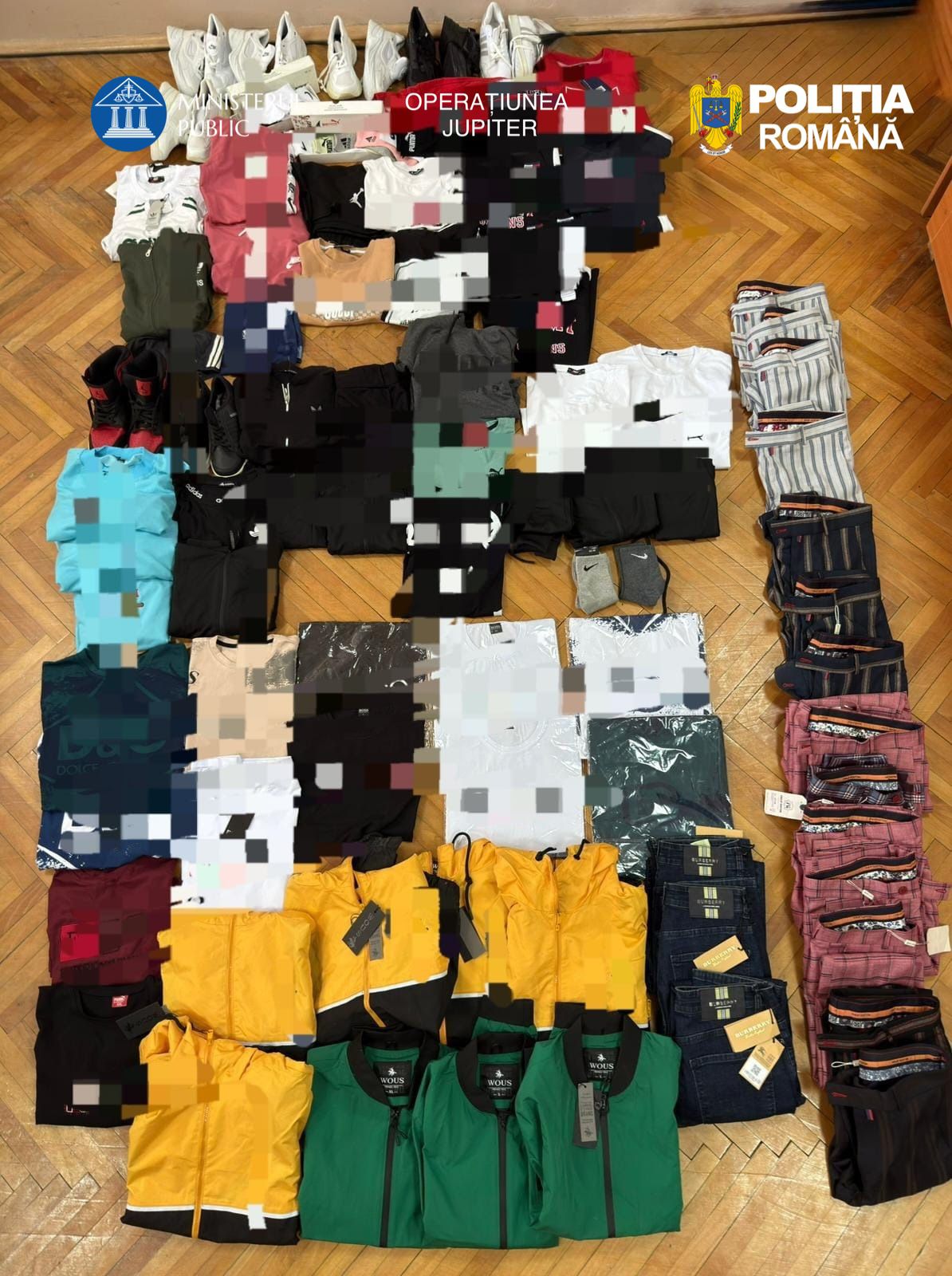 În urma perchezițiilor efectuate, au fost descoperite și ridicate, în vederea continuării cercetărilor, 162 de articole de îmbrăcăminte în valoare de aproximativ 41.000 de lei, 13 articole de marochinărie și încălțăminte în valoare de peste 2.800 de lei, precum și alte bunuri cu valoare probatorie în cauză.