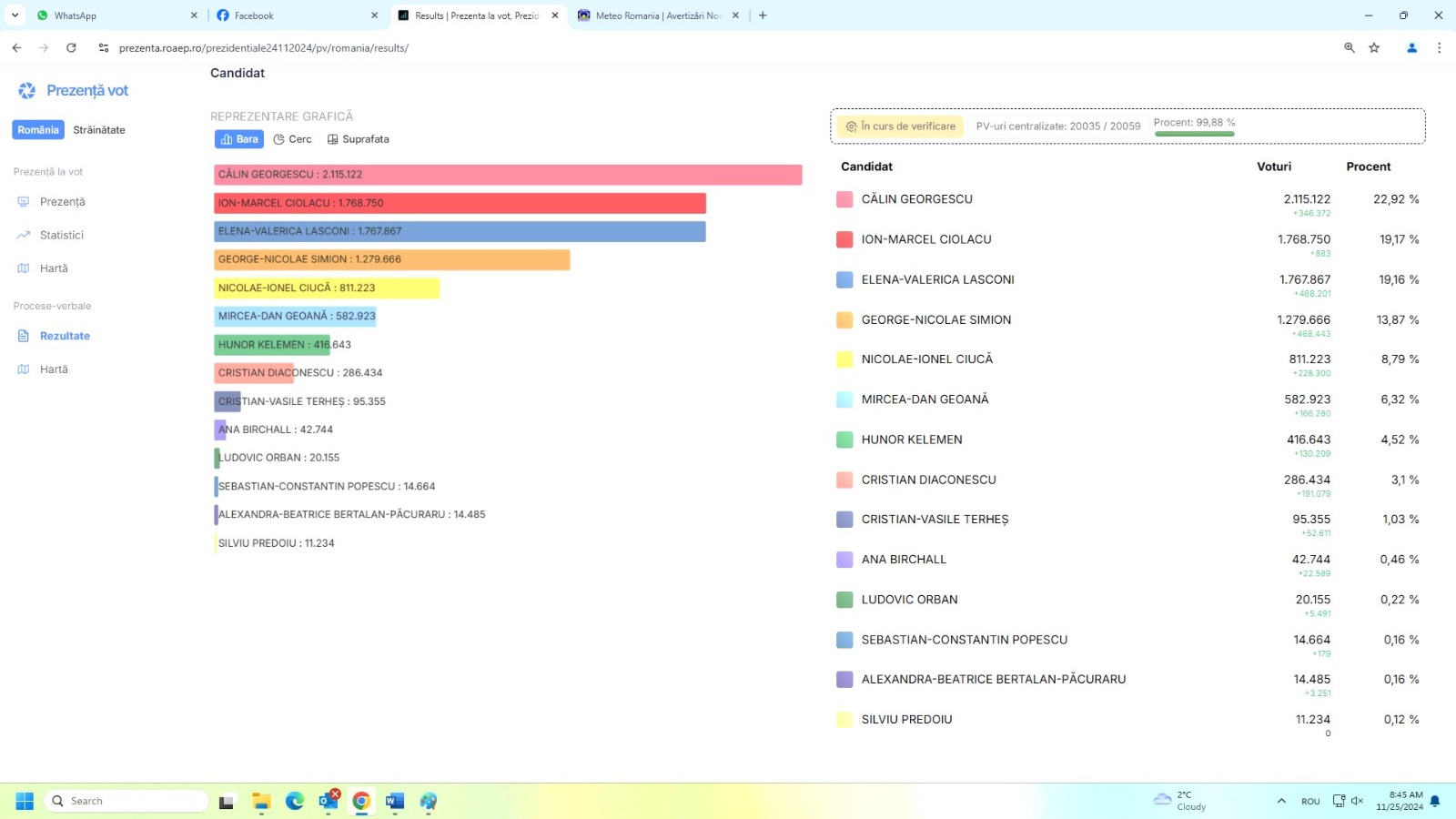Călin Georgescu conduce în continuare cu 22,92% din voturile exprimate, după centralizarea a 99,88% dintre procesele verbale. Diferenţa de voturi dintre Ciolacu şi Lasconi s-a redus considerabil