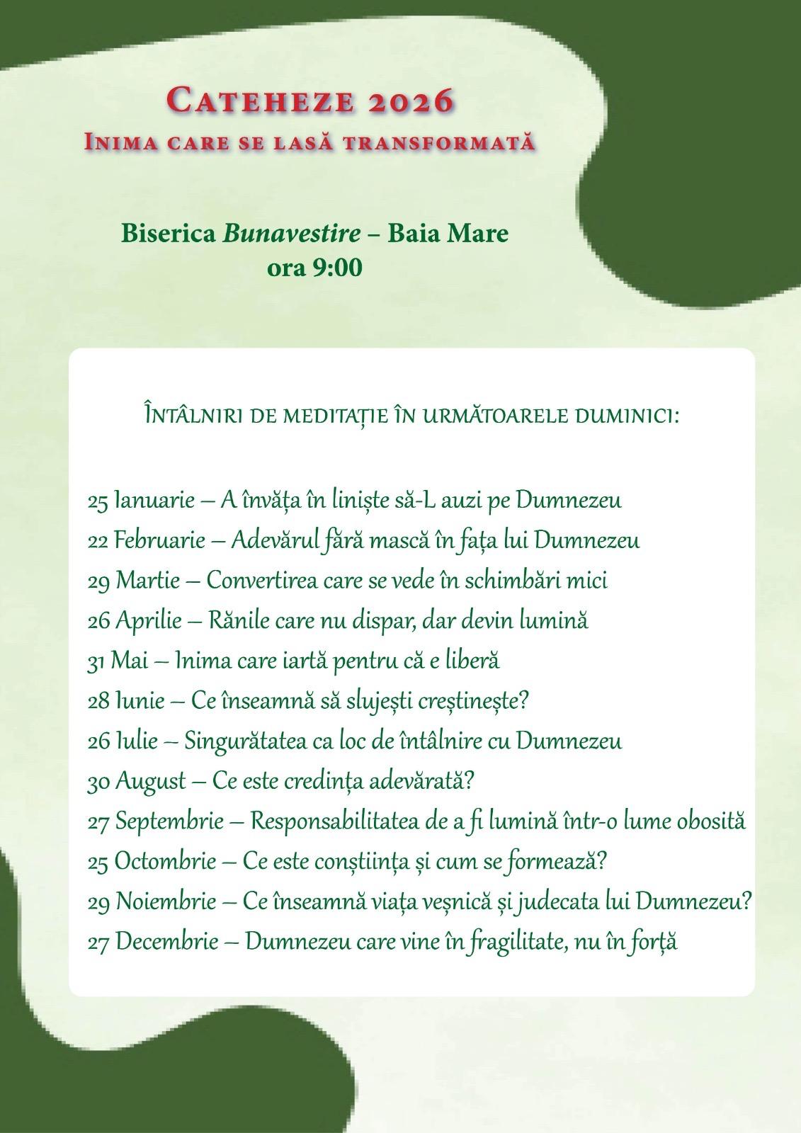 Biserica Bunavestire din Baia Mare invită credincioșii să participe, pe parcursul anului 2026, la o serie de întâlniri de cateheză și meditație spirituală, reunite sub tema „Inima care se lasă transformată”, susținute de părintele dr. George Nicoară.