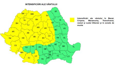 În Banat, Crișana, Maramureș, Transilvania, vestul și sudul Olteniei vântul va avea intensificări