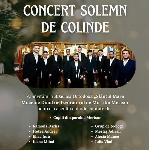 La Biserica Ortodoxă „Sfântul Mare Mucenic Dimitrie Izvorâtorul de Mir” Merișor, în 20 decembrie, ora 18:00, va avea loc Concertul solemn de colinde.