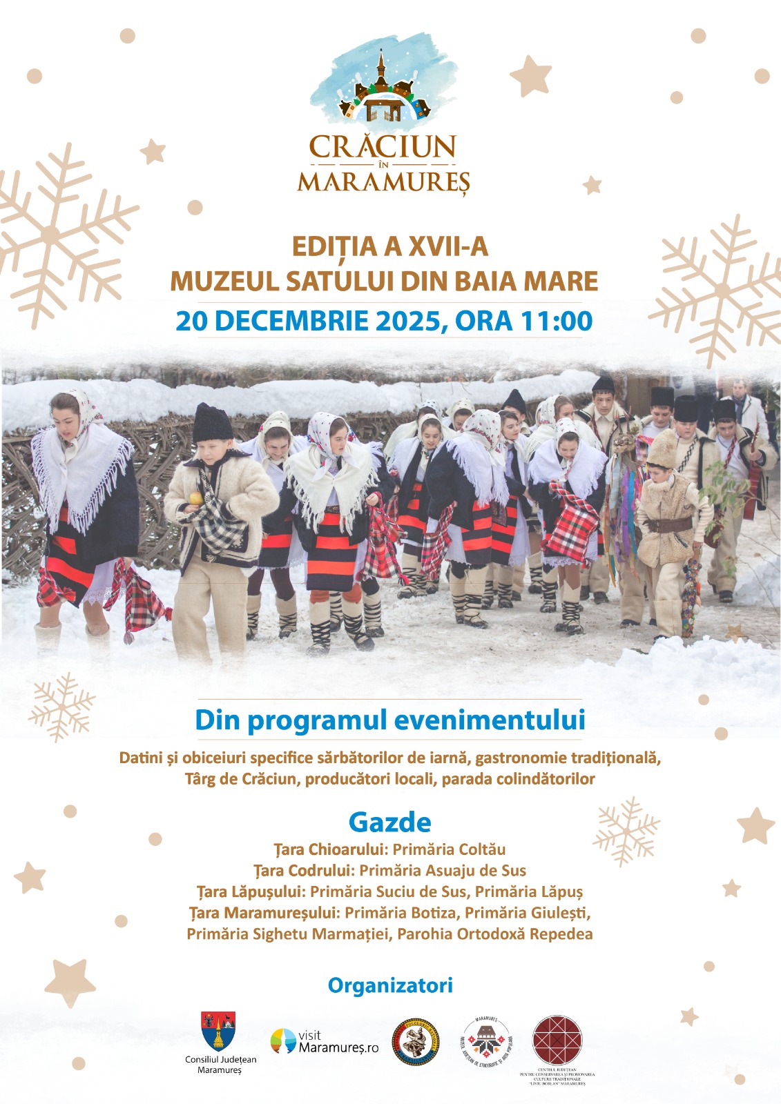 Consiliul Județean Maramureș anunță cu bucurie organizarea celei de-a XVII-a ediții a evenimentului „Crăciun în Maramureș”, unul dintre cele mai îndrăgite și autentice evenimente culturale ale județului. Sâmbătă, 20 decembrie 2025, începând cu ora 12:00, Muzeul Satului din Baia Mare va deveni din nou locul în care tradițiile de iarnă prind viață, iar Maramureșul își deschide larg porțile pentru toți cei care vor să simtă magia sărbătorilor în forma lor originală.