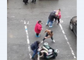 În imagini se vad mai multe persoane care o lovesc pe femeia cu handicap, iar la final un tânăr îi răstoarnă scaunul cu rotile și fuge la o mașină parcată. Autoturismul a demarat, iar trecatorii au ajutat-o pe femeia bătută.