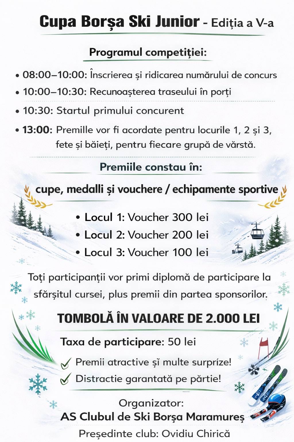 Evenimentul se va desfășura pe Pârtia Prislop din Borșa și își propune să promoveze sportul de iarnă în rândul celor mici, oferindu-le oportunitatea de a-și demonstra talentul și pasiunea pentru schi într-un cadru organizat și competitiv.