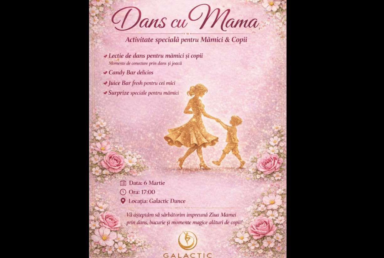 „Dans cu Mama” va avea loc de la ora 17:00, la sediul Galactic Dance. Organizatorii îi invită pe toți cei interesați să sărbătorească Ziua Mamei prin dans, zâmbete și momente magice petrecute alături de copii.