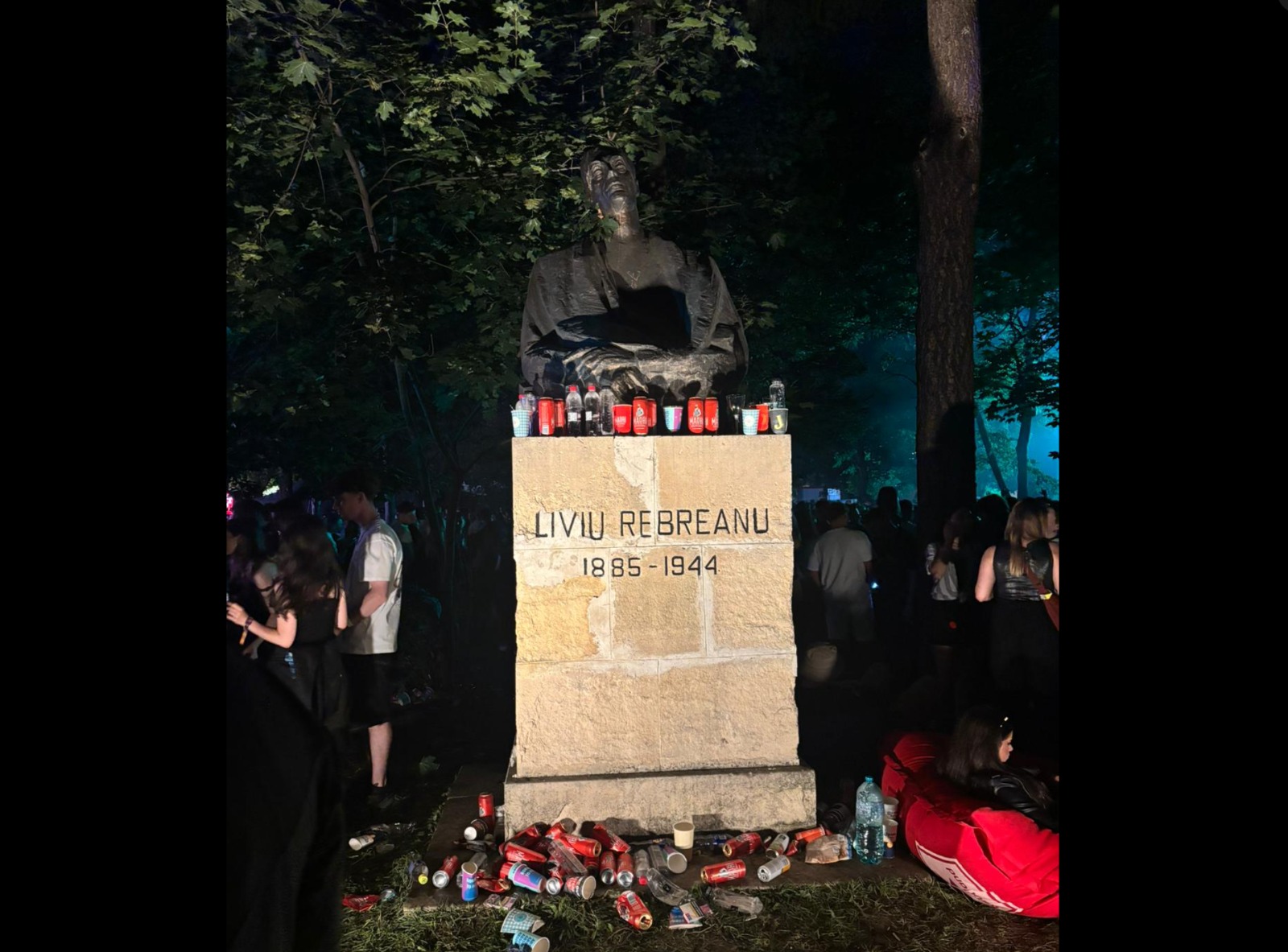 Noaptea de festival, în Cluj, a fost o simfonie de lumini, decibeli și exaltare colectivă. În mijlocul acestei exuberanțe, bustul lui Liviu Rebreanu, retras în umbra copacilor, a devenit… un bar improvizat și, inevitabil, un coș de gunoi. Pe soclu, sticle goale, pahare de plastic, doze de bere, iar jos, la picioarele lui, mizeria s-a strâns într-o coroană a prostiei moderne.