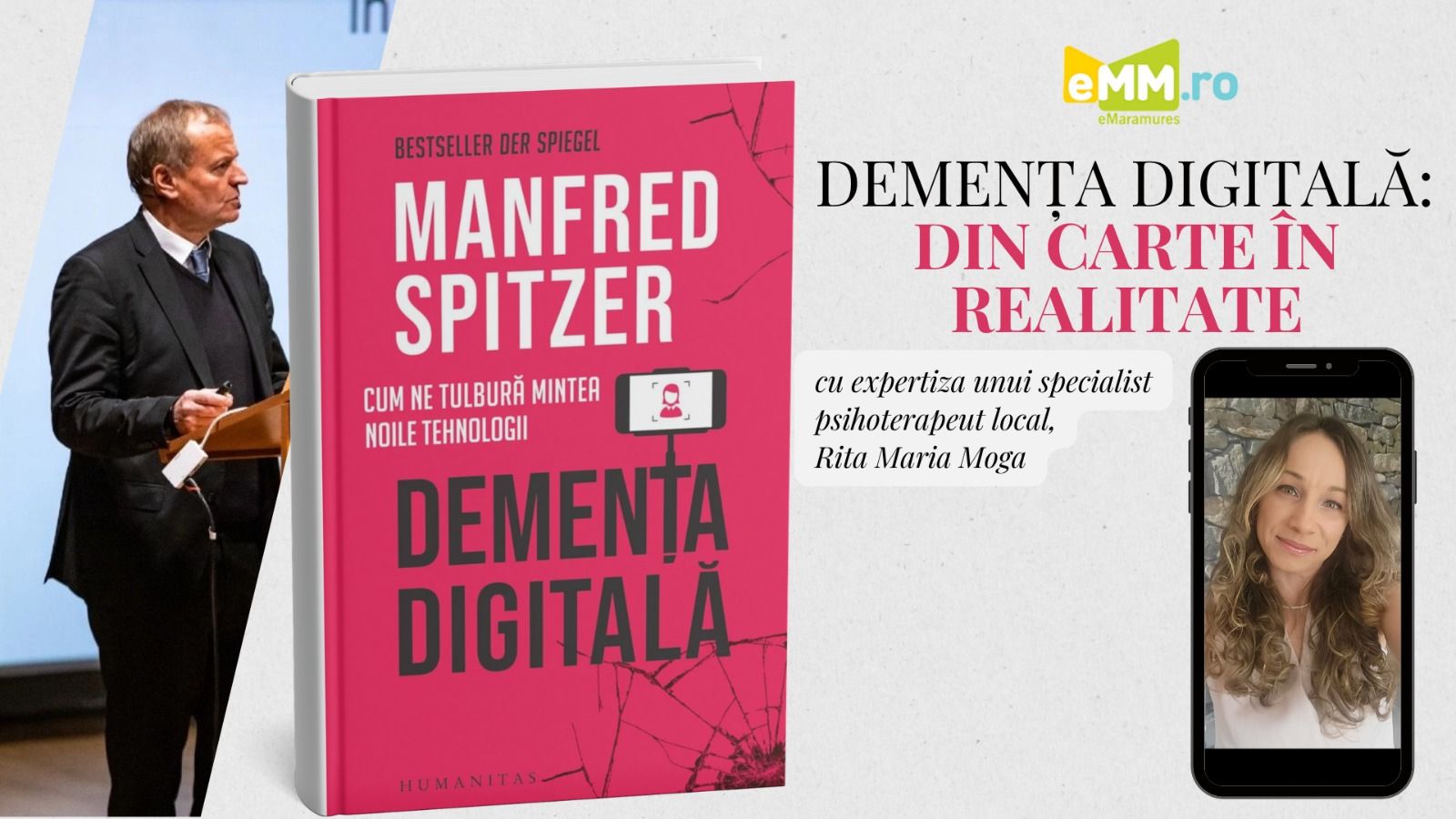 Într-o epocă în care atenția se fragmentează, iar liniștea devine rară, astfel de răspunsuri nu sunt doar utile, sunt necesare. Construit pe baza ideilor din Demența digitală și completat de expertiza clară și echilibrată a doamnei Rita Maria Moga – Psihoterapeut Adlerian autonom, Psiholog Colegiul Național „Gheorghe Șincai” / CJRAE Maramureș, acest demers jurnalistic ne invită la reflecție.