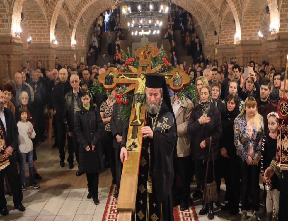 În timpul slujbei Deniilor, Preasfinţitul Părinte Episcop Iustin a scos, pe propriii umeri, prin înconjurarea Catedralei, Sfânta Cruce din Sfântul Altar, pe care a aşezat-o în centrul sfântului locaş de închinare. Este un moment impresionant, când Sfânta Cruce este scoasă din Sfântul Altar, o singură dată într-un an bisericesc, pentru ca să i se poată închina şi credincioşii, nu numai preoţii slujitori la Sfântul Altar. Credincioşii s-au închinat la Sfânta Cruce cu multă evlavie, după încheierea Deniei, formând un rând imens.