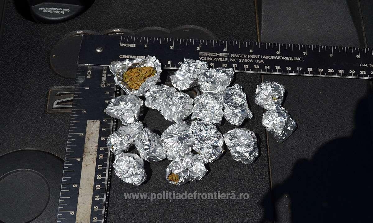 Autoturismul era condus de un cetățean român, în vârstă de 20 de ani, din județul Maramureș, iar în urma verificărilor efectuate asupra mijlocului de transport a fost descoperită, sub capotă, în compartimentul filtrului de habitaclu, o pungă cu 17 bile învelite în folie de aluminiu ce conțineau o substanță vegetală, de culoare verde oliv, posibil canabis.