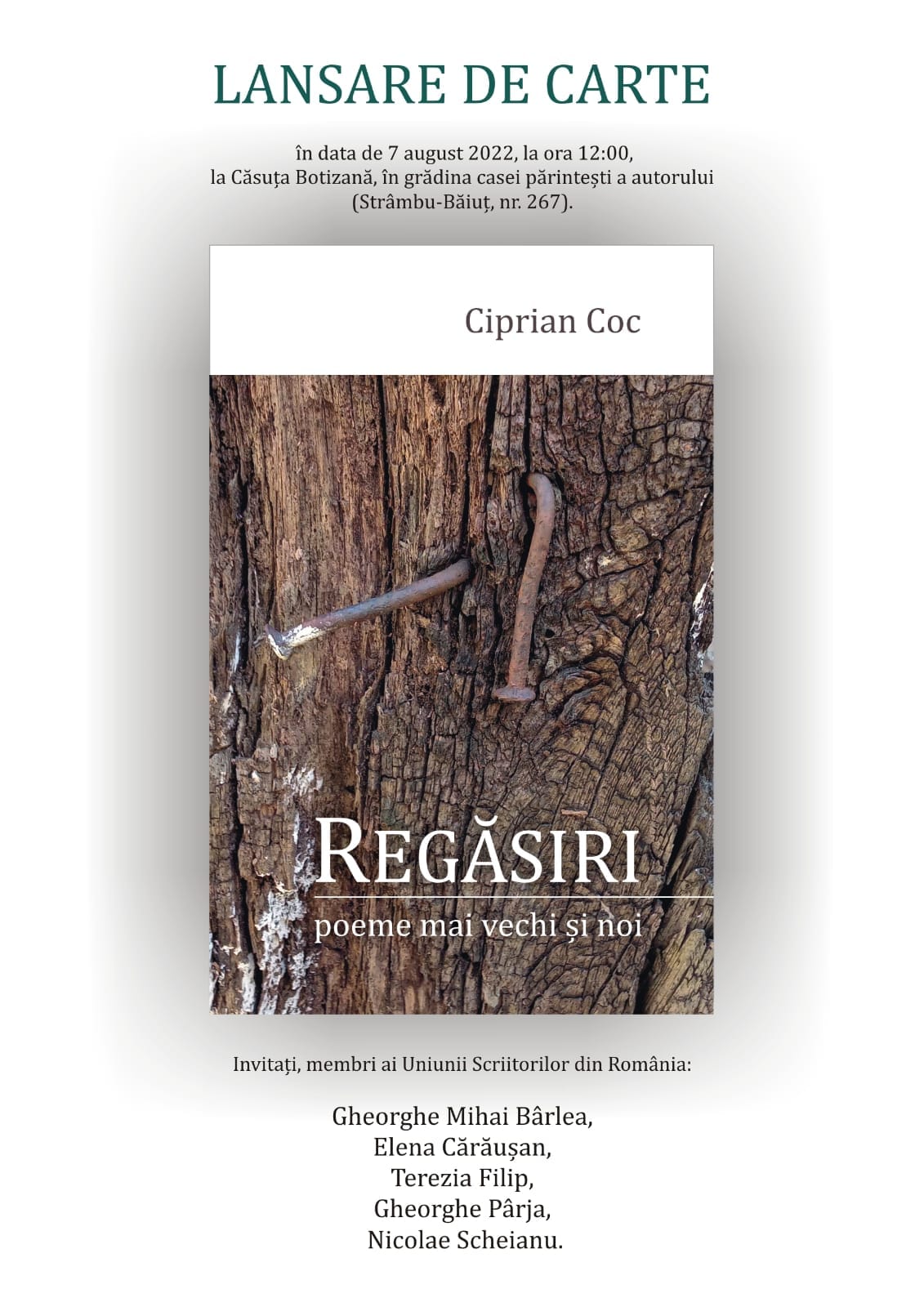 În data de 7 august, începând cu ora 12:00, într-o locație tradițională, grădina casei părintești a autorului, Ciprian Coc are lansarea volumului: Regăsiri – poeme mai vechi și mai noi.