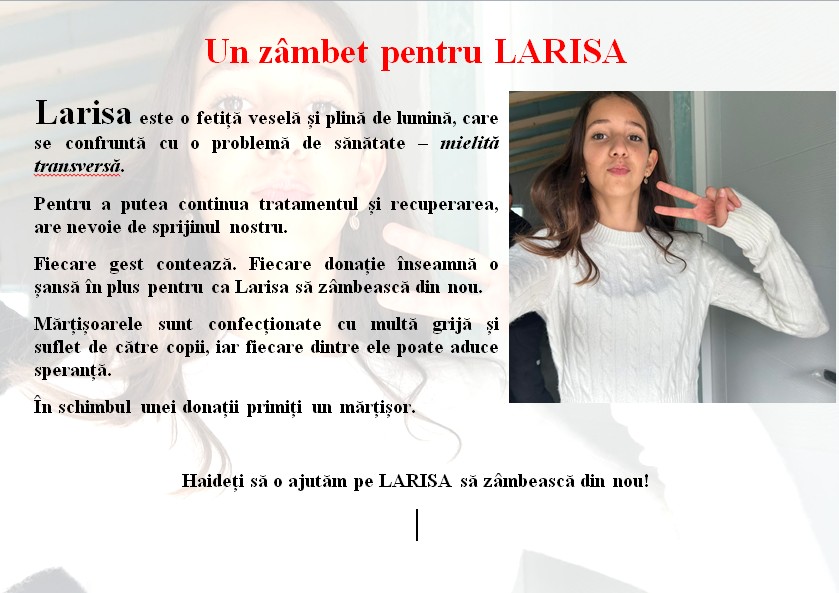 Organizatorii transmit că fiecare gest contează, iar fiecare donație înseamnă o șansă în plus pentru ca Larisa să poată zâmbi din nou.
