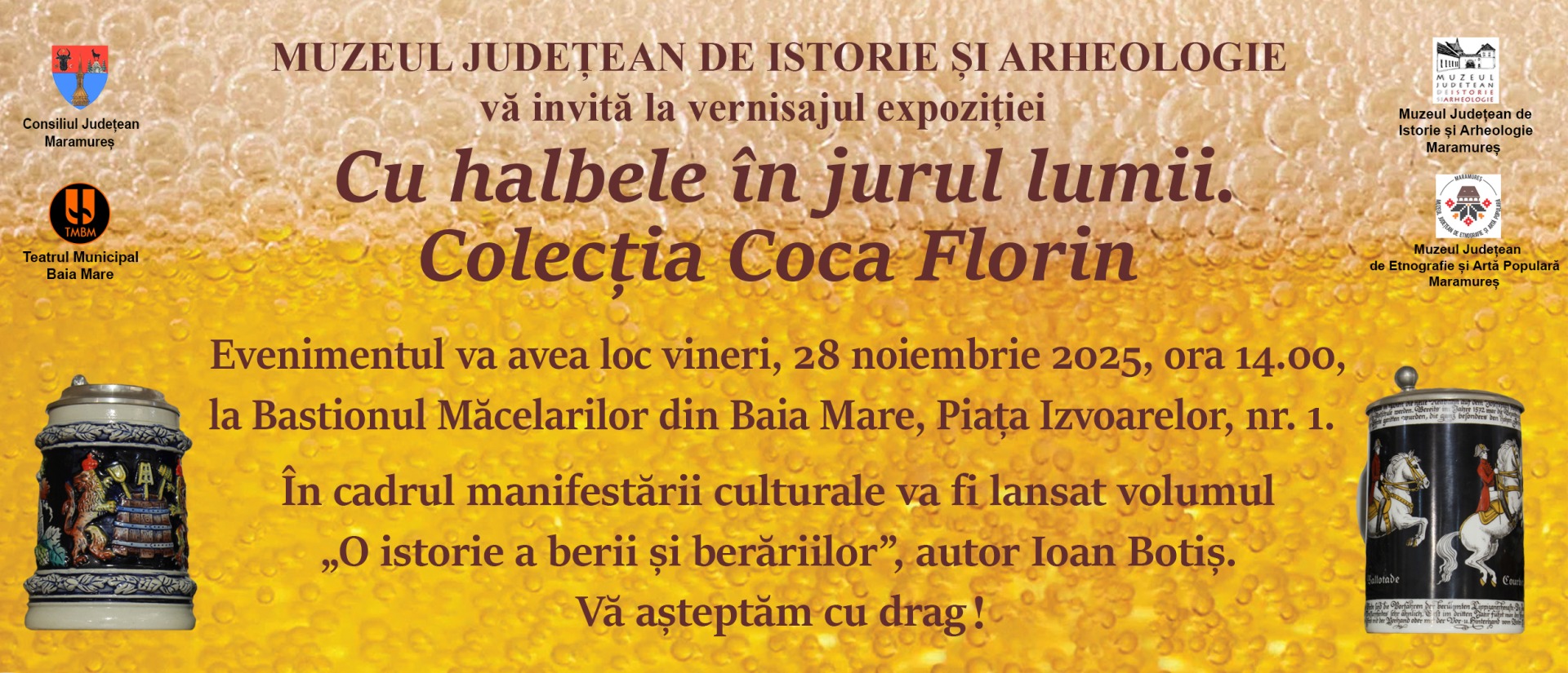 Vă așteptăm cu drag la vernisajul expoziției temporare „Cu halbele în jurul lumii. Colecția Coca Florin”, un prilej unic de a admira o colecție impresionantă formată din aproximativ 700 de halbe de bere. Colecția, adunată cu pasiune de Coca Florin cuprinde piese din întreaga lume: Europa, America de Nord, Centrală și de Sud, Africa, Asia Mică și Oceania și oferă o perspectivă globală asupra culturii berii.