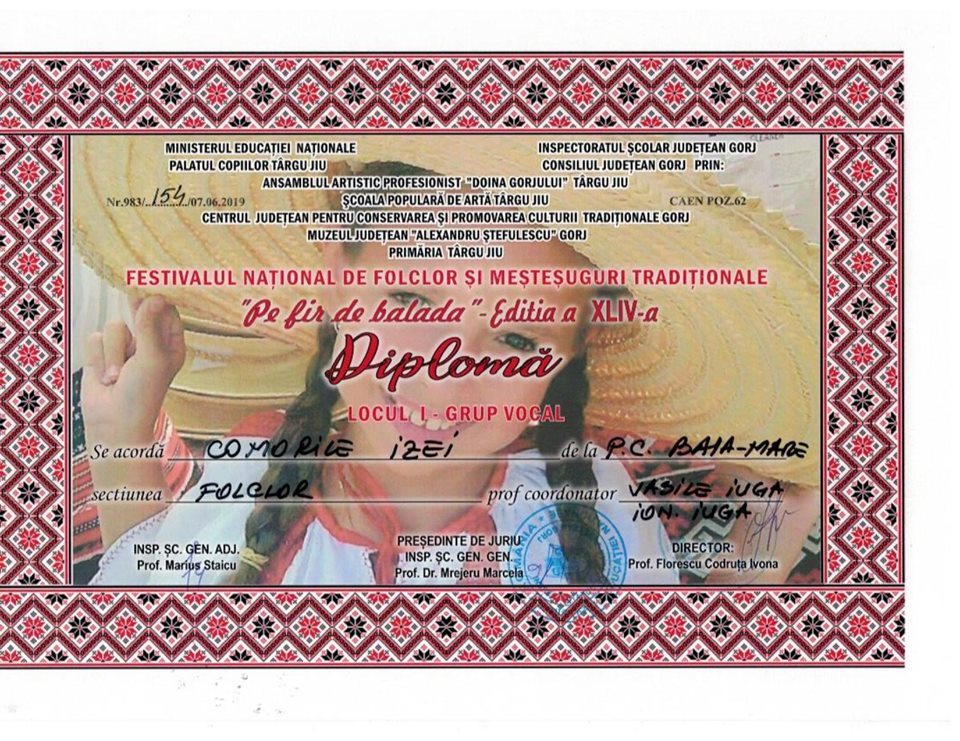Ansamblul Folcloric „Comorile Izei” al Palatului Copiilor Baia Mare, a reprezentat cu cinste Județul Maramureș la Festivalul Național de Folclor și Meșteșuguri Tradiționale ”Pe fir de baladă”, obținând locul I.