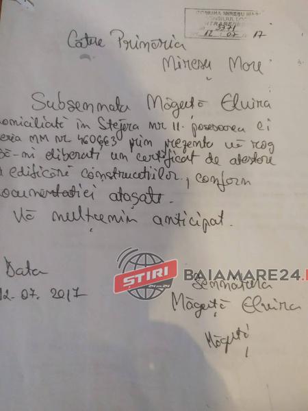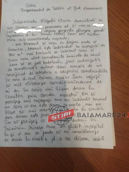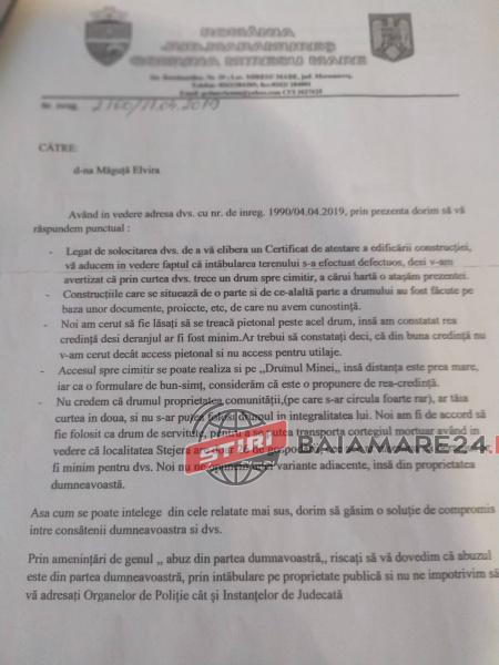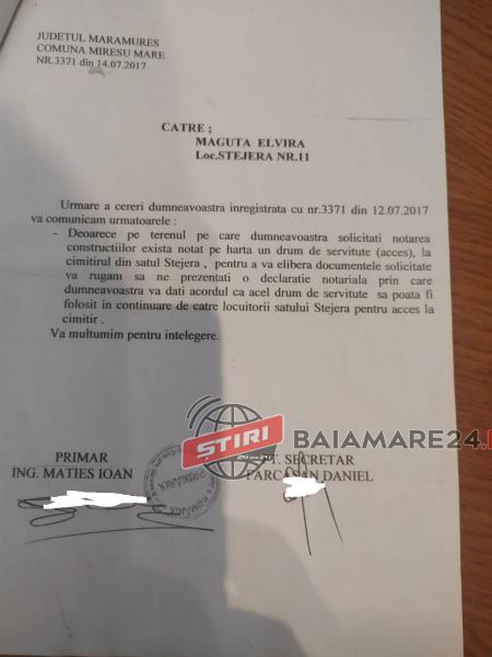”Deoarece pe terenul pe care dvs solicitați notarea construcțiilor există notat pe hartă un drum de servitute (acces) la cimitirul din satul Stejera pentru a vă elibera documentele solicitate vă rugăm să ne prezentați o declarație notarială prin care dvs să dați acordul ca acel drum de servitute să poată fi folosit în continuare de către locuitorii satului Stejera pentru acces la cimitir” a fost răspunsul semnat al primarului ing Iona Mătieș în data de 14 iulie 2017.