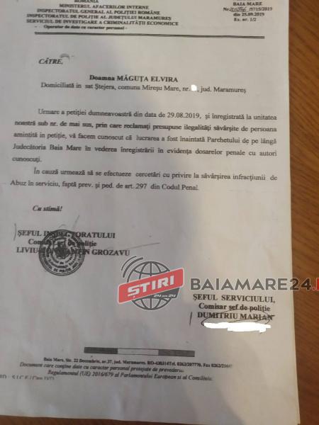 Familia despre care facem referire în acest articol a sesizat IPJ Maramureș și 25 septembrie 2019 chiar a primit un răspuns semnat de inspectorul șef al IPJ Maramureș în care erau informații că sesizarea a fost transmisă Parchetului de pe lângă Judecătoria Baia Mare ”în vederea înregistrării în evidența dosarelor penale cu autori cunoscuți. În cauză urmează să se efectuează cercetări cu privire la săvârșirea infracțiunii de abuz în serviciu, faptă prev. și pedepsită de articolul 297 din Codul Penal”.