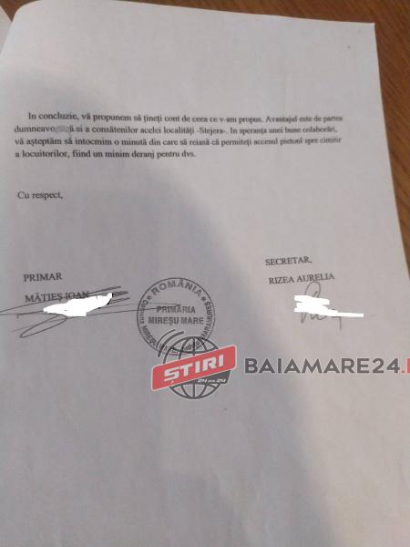 Câteva zile mai târziu, pe 11 aprilie 2019, edilul răspunde solicitării venite de la familia din Stejera. ”în concluzie vă propunem să țineți cont de ceea ce v-am propus. Avantajul este de partea dumneavoastră și a consătenilor acelei localități – Stejera. În speranța unei bune colaborări, vă așteptăm să întocmim o minută din care să reiasă că permiteți accesul pietonal spre cimitir a locuitorilor, fiind un minim deranj pentru dvs”. Asta după ce în același răspuns primarul susținea că s-a ”întăbularea terenului s-a făcut defectuos, deși v-am avertizat că prin curtea dvs trece un drum spre cimitir”.