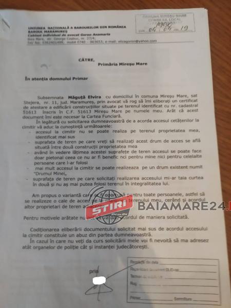 La 4 aprilie 2019 familia prin avocat a solicitat din nou eliberarea certificatului de atestare a construcțiilor situate pe terenul respectiv, menționând că acest document le este necesar la Cartea Funciară. ”În legătură cu solicitarea dvs de a acorda accesul cetățenilor la cimitir vă aduc la cunoștință următoarele: accesul la cimitir nu se poate realiza pe proprietatea mea; suprafața de teren pe care vreți să realizați acest drum de acces se află situată între două construcții aflate în proprietatea mea; având în vedere lățimea acestei suprafețe de teren accesul se poate face doar pietonal ceea ce nu ar fi benefic nici pentru mine, nici pentru celălalte persoane care l-ar folosi; mai mult accesul la cimitir se poate realiza pe un drum existent denumit Drumul Minei; suprafața de teren pe care solicitați realizarea accesului mi-ar tăia curtea în două și nu aș mai putea folosi terenul în integralitatea lui. Am propus o variantă care ar fi oportună pentru toate persoanele astfel să se realizeze o cale de acces pe la marginea terenului meu, cerând și acordul altor proprietari de teren adiacente. Pentru motivele arătate nu pot să vă dau acordul de maniera solicitatea. Condiționarea eliberării documentului solicitat mai sus de acordul accesului la cimitir constituie un abuz din partea dvs”