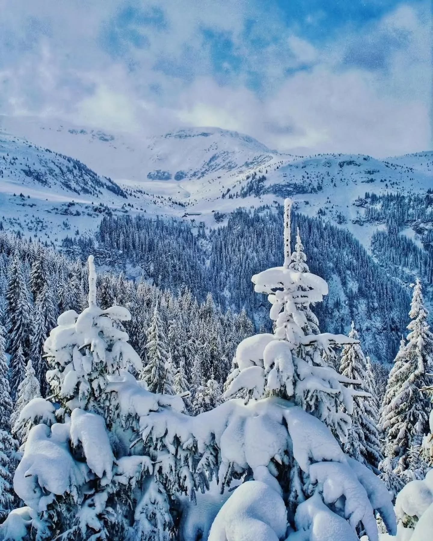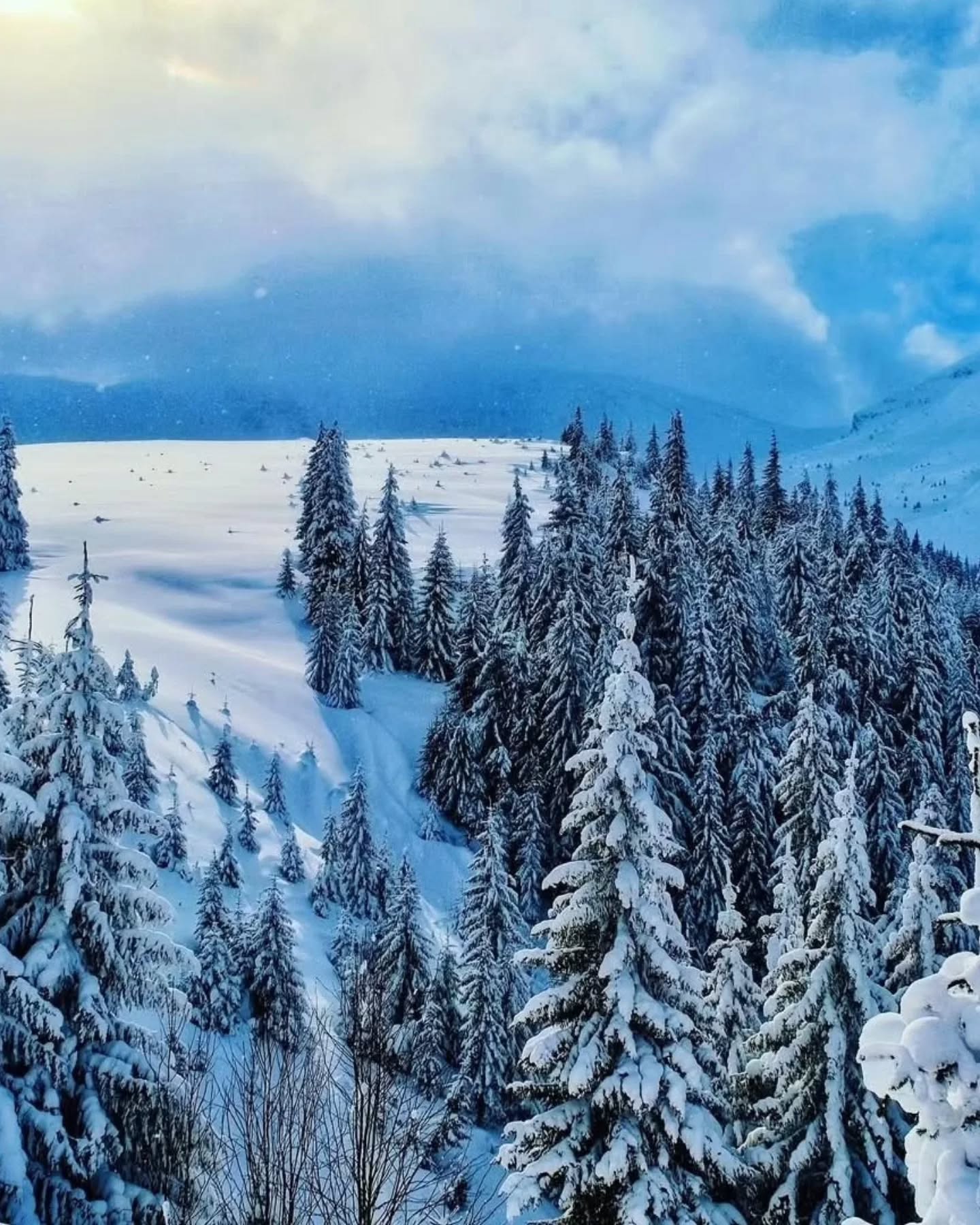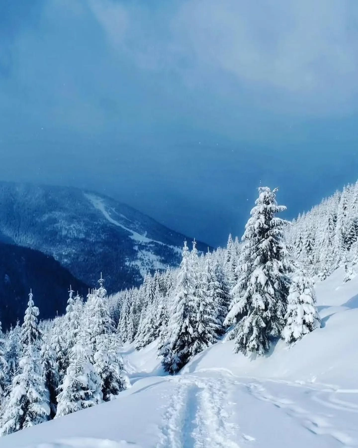 de iarnă autentică. Zăpada s-a așternut uniform peste vârfuri, poteci și păduri, oferind imagini spectaculoase care amintesc de frumusețea sălbatică a acestui masiv.