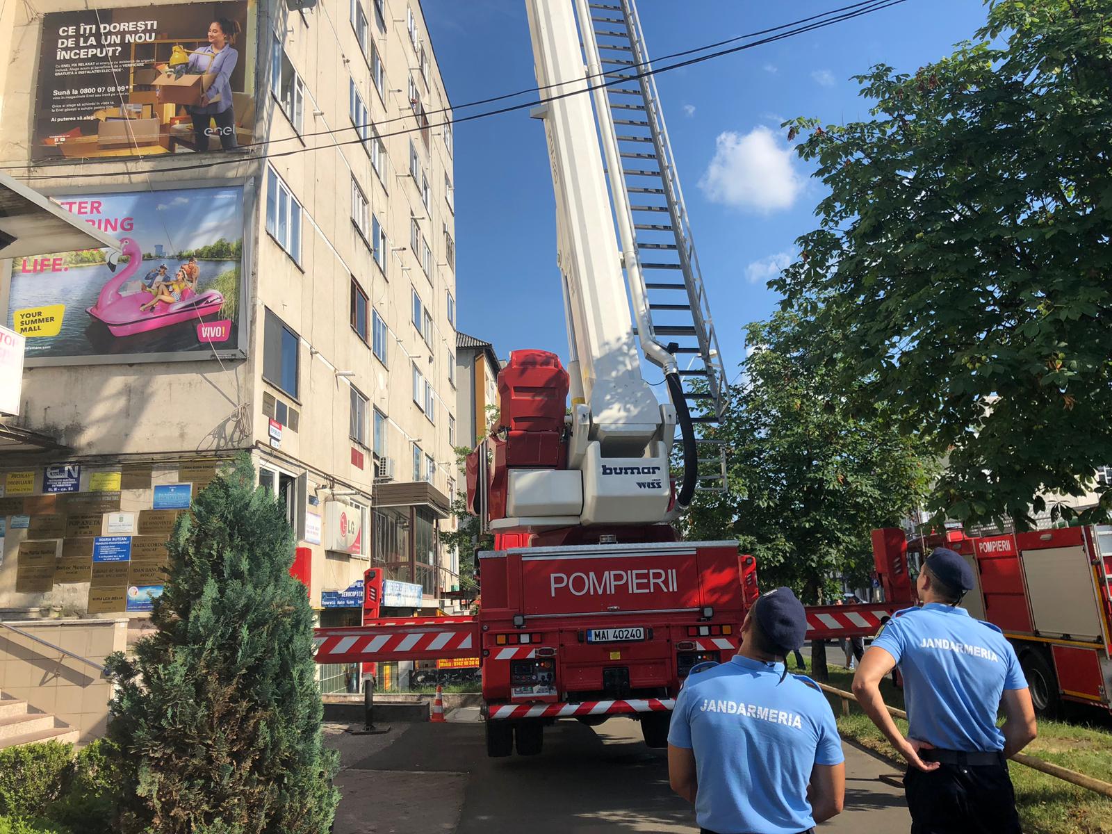 Ajunși la fata locului pompierii au urcat cu scara specială până la geamul unde se afla bărbatul.