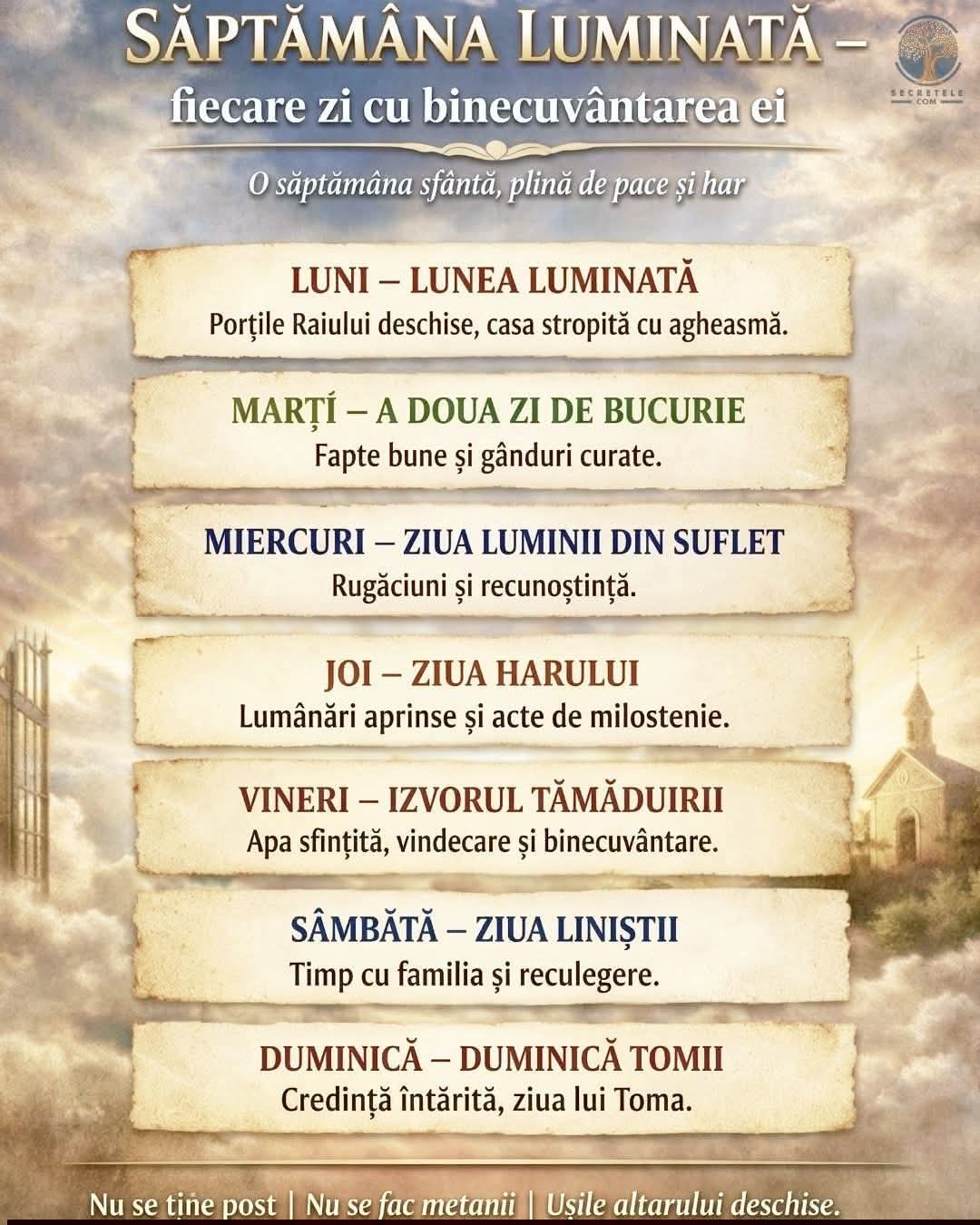 După sărbătoarea Învierii, a doua zi de Paște îi îndeamnă pe credincioși să participe la slujbele religioase, marcând începutul Săptămânii Luminate. Intervalul păstrează spiritul pascal, oferă liniște sufletească și devine un timp dedicat cugetării, iertării și comuniunii. Salutul „Hristos a Înviat!” primește acum răspunsul „Adevărat a Înviat!”, menținând viu mesajul biruinței vieții asupra morții.