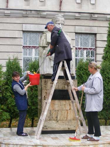 O situatie rara, azi, 27 octombrie, in Baia Mare, care, din pacate, a avut foarte putini martori, desi s-a intamplat chiar in buricul urbei. Totul a inceput in jurul orei 11.15. Trei baimareni, un barbat si doua femei, s-au apucat sa studieze cu atentie bustul savantului Gheorghe Sincai, amplasat in fata renumitului colegiu din Maramures. S-au invartit in jurul statuii, s-au incruntat la literatul roman si… s-au pus pe treaba. In doi timp si trei miscari, barbatul in halat albastru muncitoresc si cu pantaloni de trening a inaltat o scara in fata lui Sincai, cat sa il poata privi drept in ochi pe batranul savant. Ajutoarele sale, ca doua muze, s-au pus de-o parte si alta, sprijind scara cu o mana hotarata.