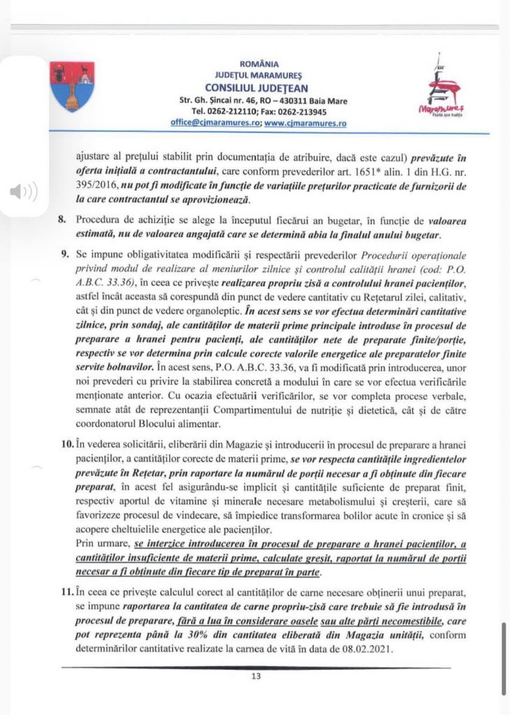 Raportul redactat, în urma controlului a scos la iveală nereguli crease și vinovați pentru meniul mai mult decât sărăcuț ar fi de fapt angajații care au furat, potrivit raportului, până și morcovii și pătrunjelul din supa bolnavilor. Să nu mai vorbim de lipsa la cântar, adică porțiile înjumătățite ca greutate, pe scurt 17 pagini scrise negru pe alb de nereguli.