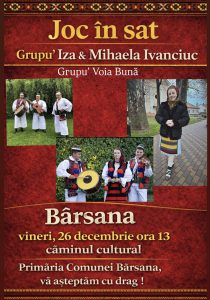 Locuitorii din Bârsana sunt invitați la un eveniment deosebit, plin de tradiție și muzică populară autentică. Vineri, 26 decembrie, de la ora 13:00, la Căminul Cultural din Bârsana, va avea loc spectacolul „Joc în sat”, dedicat păstrării obiceiurilor și valorilor maramureșene.