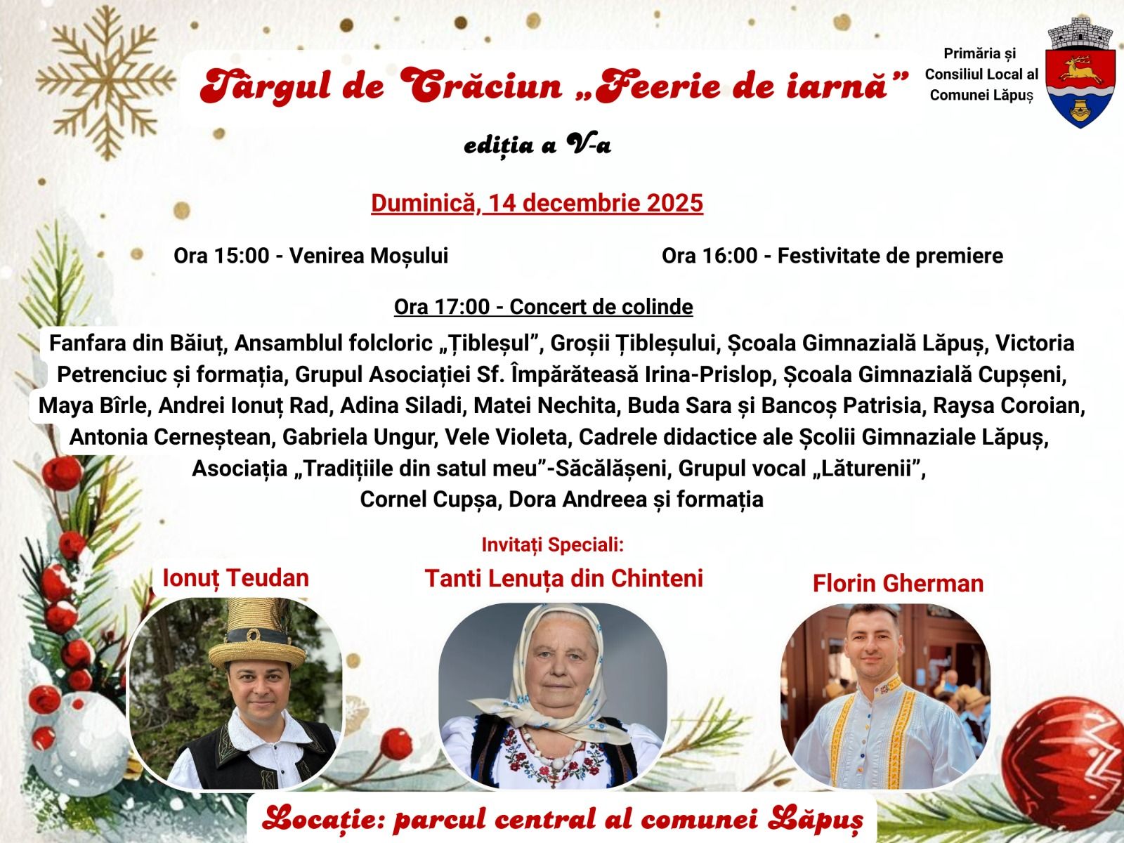 Comuna Lăpuș devine, duminică, 14 decembrie 2025, epicentrul sărbătorilor de iarnă din zonă, odată cu organizarea Târgului de Crăciun „Feerie de iarnă”, ajuns la ediția a V-a. Evenimentul, organizat de Primăria și Consiliul Local al Comunei Lăpuș, va avea loc în parcul central al comunei și promite o zi plină de emoție, tradiție și spirit autentic românesc.
