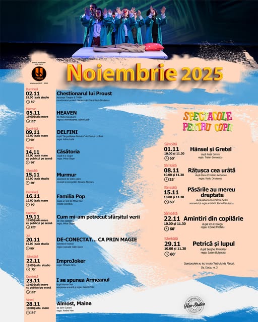Programul lunii noiembrie a spectacolelor Teatrului Municipal Baia Mare. Biletele pot fi achiziționate online: https://shorturl.at/KH3Z8, sau la casierie: luni și marți: ÎNCHIS (doar rezervări telefonice), miercuri și joi: 12.00 – 14.00, vineri, sâmbătă și duminică: 17.30 – 19.30. Informații și rezervări: tel. 0736216437 (Dramă și Revistă). Programul rezervărilor telefonice: luni – vineri: 11.00 – 16.00, sâmbătă: 12.00 – 13.00. Rezervările se ridică cu cel puțin 30 de minute înainte de începerea spectacolului.