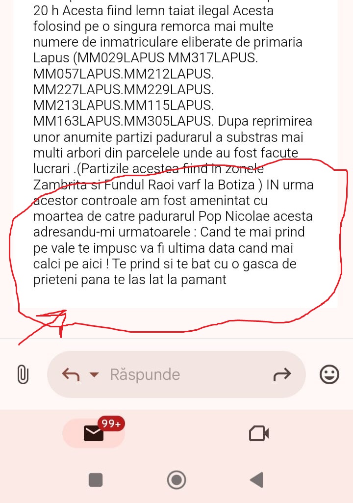 Cel despre care spune că l-a amenințat este pădurarul Nicolae Pop, angajat al ocolului silvic și responsabil de mai multe zone în care am documentat tăieri ilegale, confirmate și de controale ale Gărzii Forestiere, Poliției, ale ocolului silvic, respectiv Direcției Silvice Maramureș.
