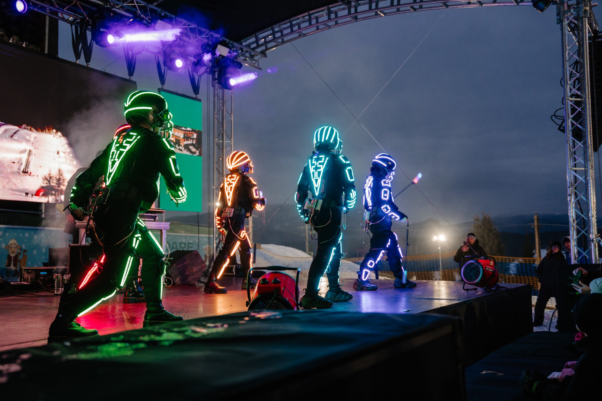 Spre seară, evenimentul a căpătat o notă spectaculoasă. Show-ul de costume luminate, desfășurat pe muzică, a transformat pârtia într-un joc de culori și mișcare, pregătind publicul pentru unul dintre cele mai impresionante momente ale serii: coborârea cu torțe a echipei Salvamont. Șirul de lumini care a brăzdat pârtia în întuneric a fost întâmpinat cu aplauze și exclamații de uimire, încheind ziua într-un mod cu adevărat memorabil.