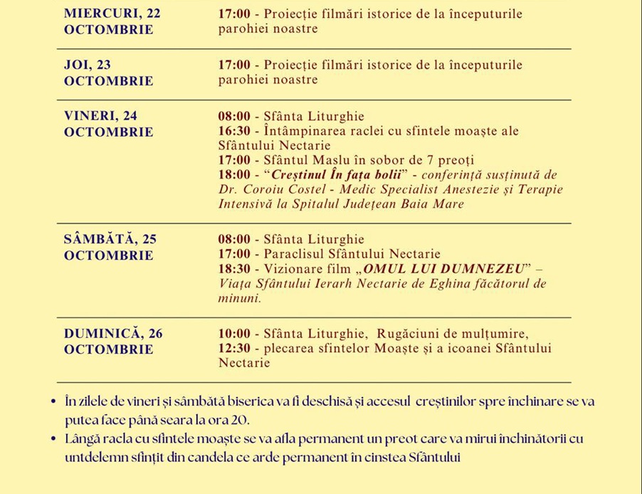 Cu binecuvântarea Preasfințitului Iustin, Episcopul Maramureșului și Sătmarului, în anul aniversării parohiale – 35 de ani de la înființarea Parohiei „Soborul Sfinților 12 Apostoli” Baia Mare și 25 de ani de la sfințirea bisericii cu hramul „Soborul Sfinților 12 Apostoli”, biserica cinstește lucrarea duhovnicească a Sfântului Nectarie din Eghina – tămăduitor și mângâietor. Sfintele Moaște vor fi spre cinstire în biserică în perioada 24-26 octombrie.