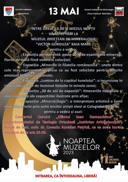 Sâmbătă, 13 mai, Muzeul de Mineralogie „Victor Gorduza” Baia Mare vă invită să celebraţi cea de-a XIX-a ediție a Nopții Europene a Muzeelor. Vizitatorii sunt aşteptaţi începând cu ora 18.00, până la ora 24.00 (ultima intrare la ora 23:30).