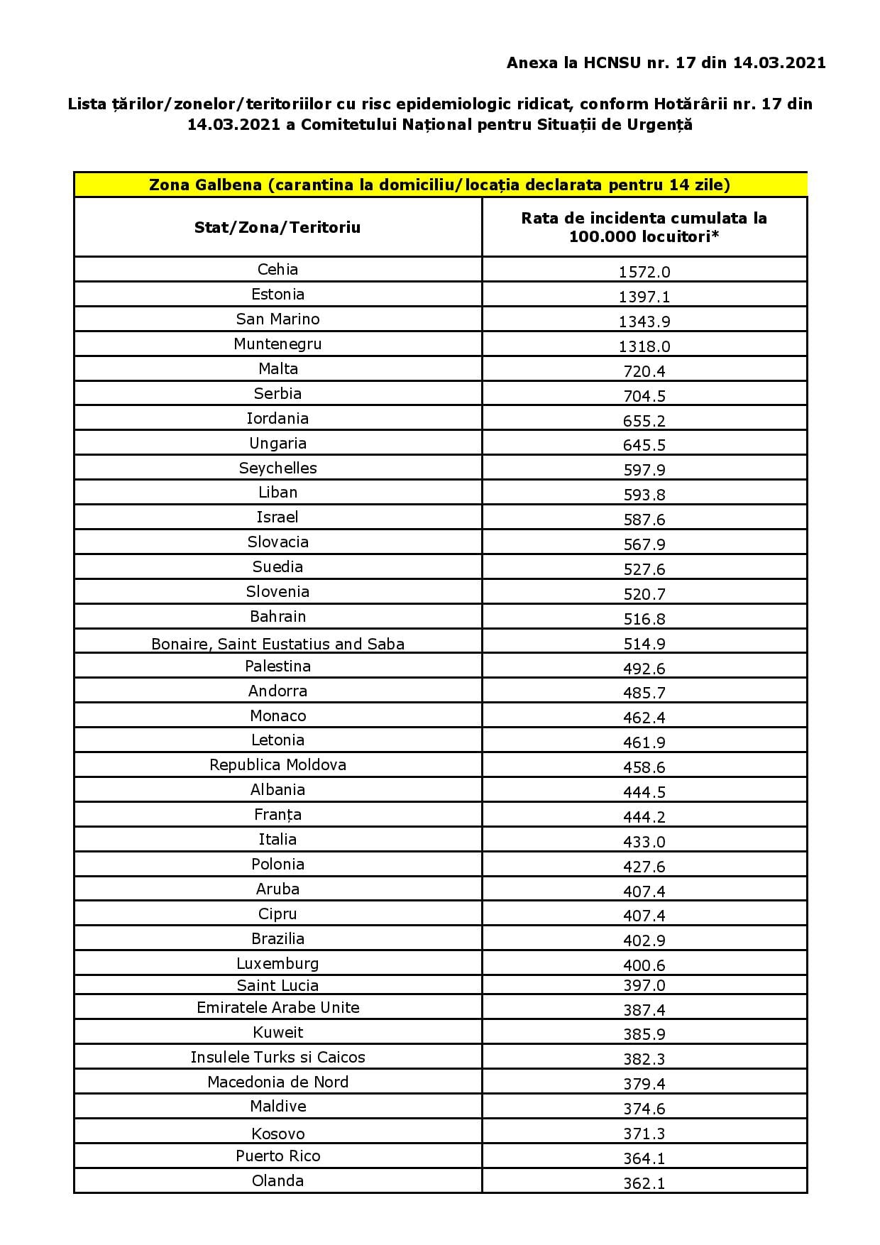 Prin decizia CNSU din 14 martie 2021 a fost actualizată lista țărilor, zonelor și teritoriilor de risc epidemiologic pentru care se instituie măsura carantinei pentru persoanele care sosesc în România din acestea.
