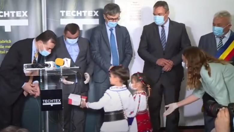 Ca urmare, gazdele au pregătit un moment în care doi copii preșcolari îmbrăcați în costume populare, unul dintre ei având mască de protecție pe față, au venit la premier și i-au oferit câte o cutie cu măști pentru copii.