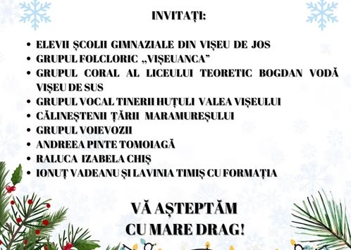 Duminică, 21 decembrie, începând cu ora 12:30, vă așteptăm la Vișeu de Jos, la parada portului popular. Colindătorii vor porni din fața Primăriei și vor merge până la Căminul Cultural, unde de la ora 13:00, va avea loc ediția a III-a a Concertului de colinde Îngerul, un eveniment special care își propune să aducă întreaga comunitate împreună și să devină o tradiție frumoasă organizată an de an.