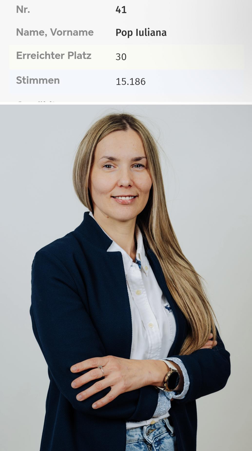 Candidând din partea formațiunii Freie Wähler, Iuliana Pop a reușit să obțină 15.186 voturi, urcând nu mai puțin de 11 poziții într-o competiție puternică, la care au participat aproximativ 70 de candidați.