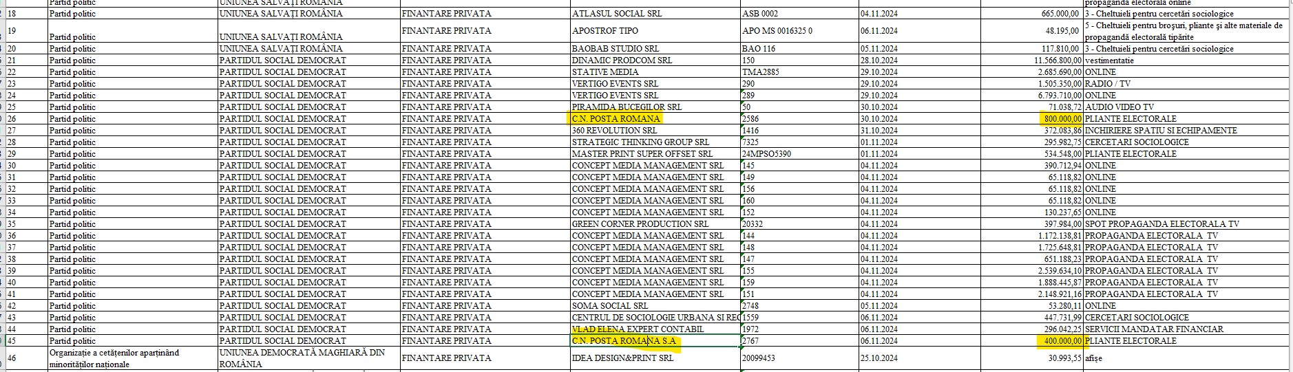 De exemplu, Compania Națională contribuie la campania electorală dusă de PSD cu peste 120.000.000 lei pentru „pliante electorale”. În timp ce destui agenți poștali își cumpără din banii lor gențile în care să ducă pensiile oamenilor. Acum, în perioada de campanie, se pare că vor duce și „mizeriile electorale” tipărite la ordinul dat de PSD.