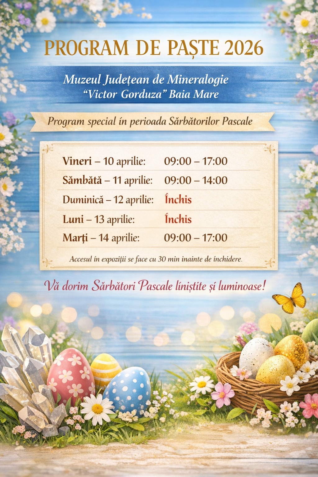 Muzeul Județean de Mineralogie „Victor Gorduza” din Baia Mare anunță programul special de vizitare în perioada Sărbătorilor Pascale. Instituția va funcționa cu orar redus în zilele de 10 și 11 aprilie, va fi închisă în prima și a doua zi de Paște, urmând să revină la program normal începând de marți, 14 aprilie.