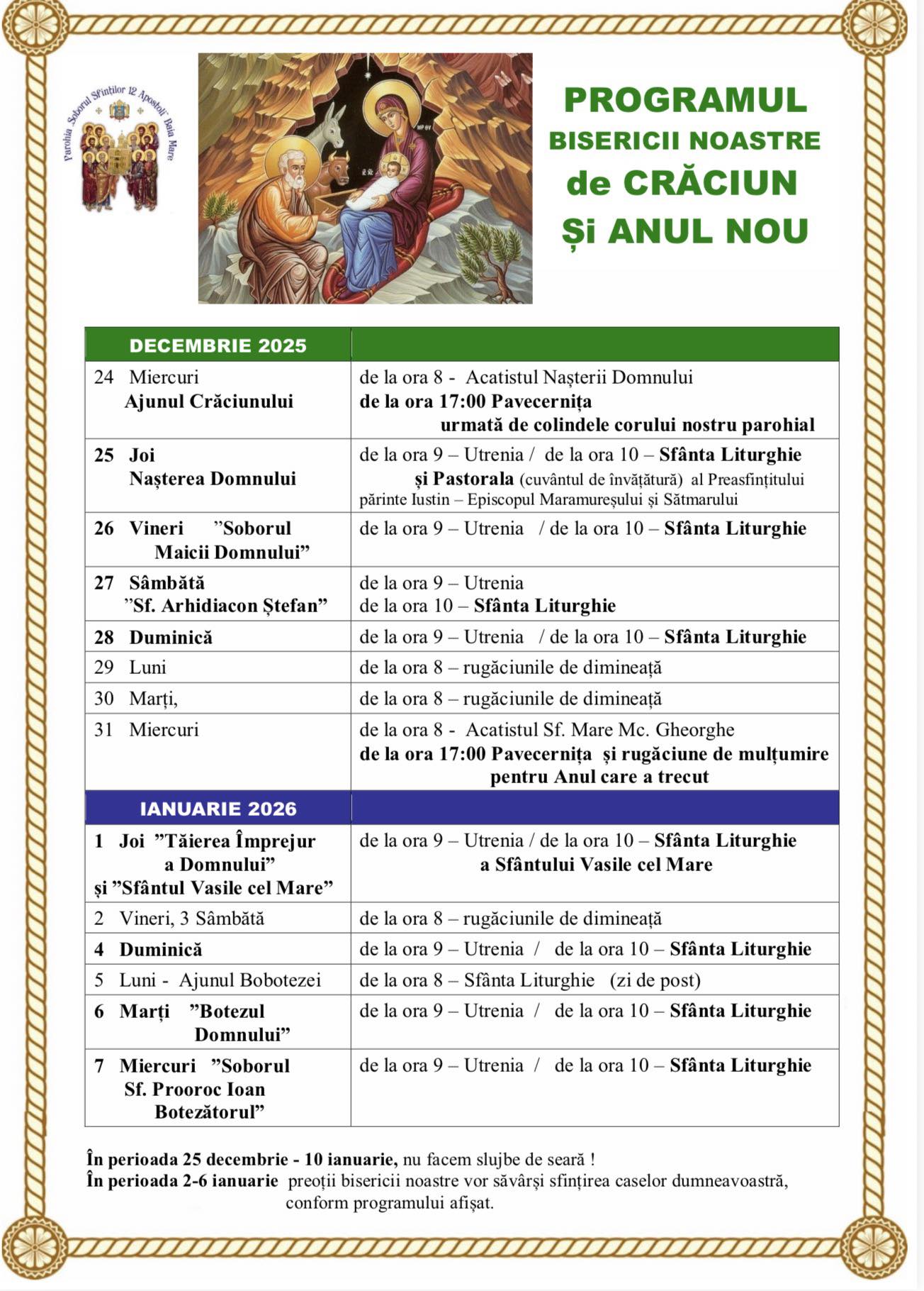 Credincioșii care frecventează Biserica ortodoxă „Soborul Sfinților 12 Apostoli” din Baia Mare sunt invitați să participe la slujbele dedicate sărbătorilor de Crăciun și Anul Nou după următorul programul liturgic.