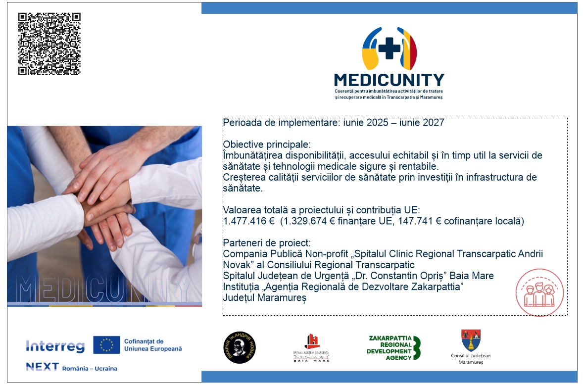 Consiliul Județean Maramureș implementează, alături de partenerii săi, Spitalul Regional Transcarpatia din Uzhgorod (Ucraina) – partener lider, împreună cu Agenția de Dezvoltare Regională Transcarpatia (Ucraina) și Spitalul Județean de Urgență ”Dr. Constantin Opriș” Baia Mare, proiectul ”MEDICUNITY – Coerență pentru îmbunătățirea activităților de tratare și recuperare medicală în Transcarpatia și Maramureș”, finanțat prin Programul Interreg NEXT România – Ucraina 2021-2027.